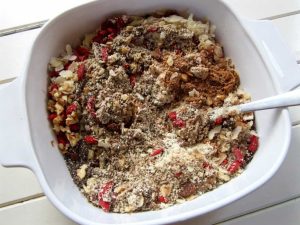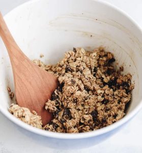 2. Добавете овесените ядки, чия семената и щипката сол. Ако искате шоколада вътре, натрошете го на малки парченца и го добавете. Разбъркайте, докато се получи лепкава смес.