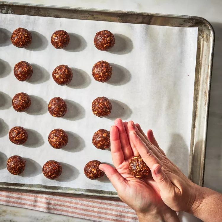 3. С ръце оформете малки топчета (около 20-25 г всяко). Ако сместа лепне, намокрете ръцете си леко.